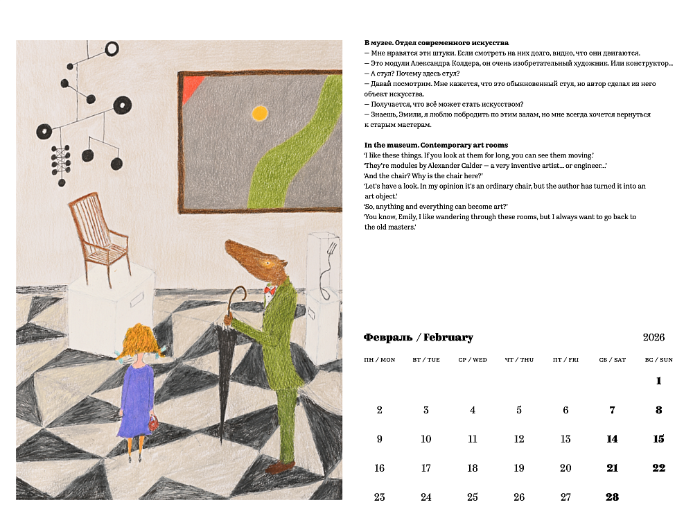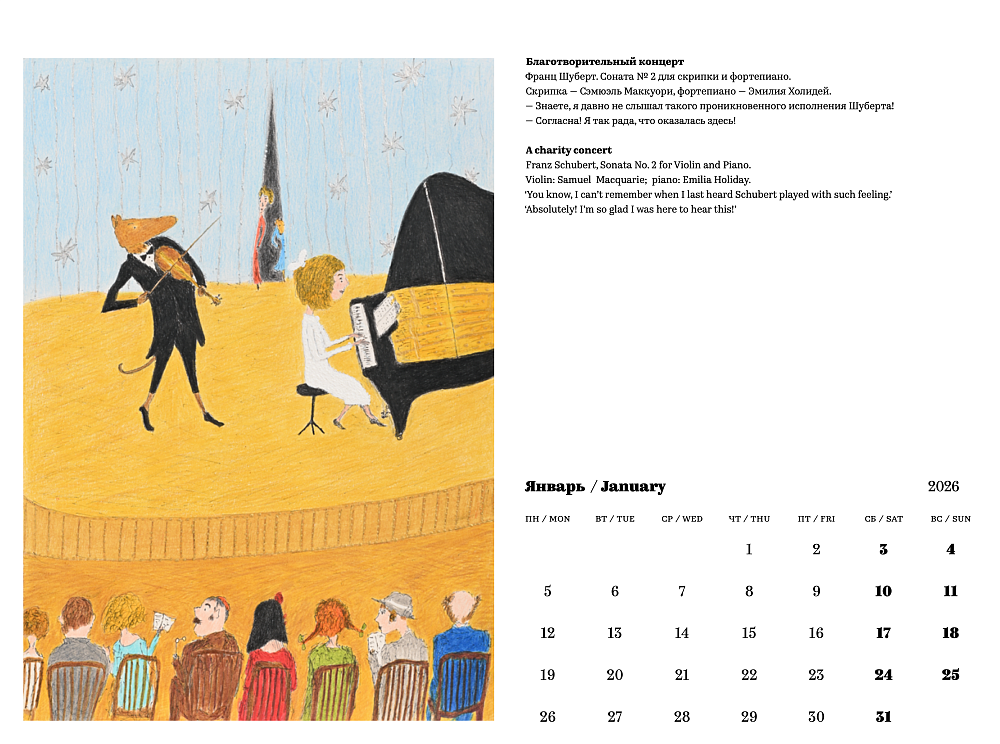 В календаре представлены страницы из иллюстрированной книги о дружбе и приключениях юной Эмили Холидей и ученого-антрополога из Австралии Сэмюэля Маккуори. Книга будет издана в 2026 году.