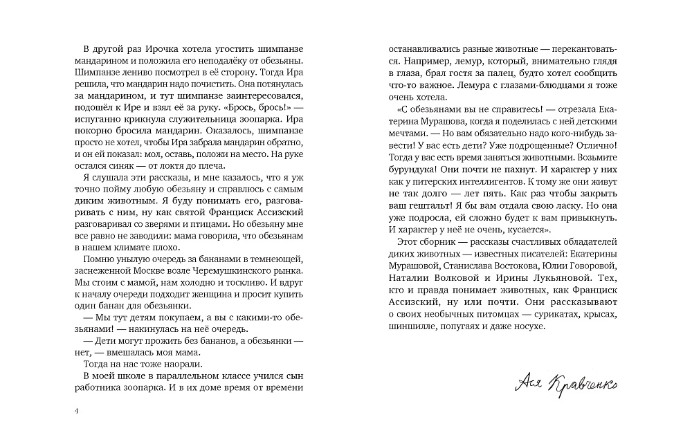 У царя Соломона было волшебное кольцо, которое позволяло ему разговаривать с любым зверьём, рыбами, птицами и ползающими тварями. «Кто у нас такой хороший» — рассказы известных писателей — счастливых обладателей диких животных: Екатерины Мурашовой, Станислава Востокова, Юлии Говоровой, Наталии Волковой и Ирины Лукьяновой. У них нет волшебного кольца, но они понимают своих питомцев — сурикатов, крыс, шиншилл, попугаев и носух — как царь Соломон. Ну или почти.