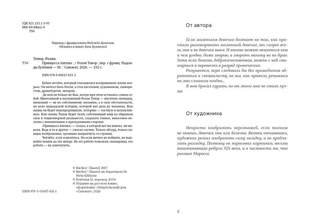 «Принцесса Ангина» — сказка, в которой нет ни намека, ни морали. Ведь и то и другое — ужасно скучно. Только абсурд, только химеры воображения, грозящие выпрыгнуть со страниц.