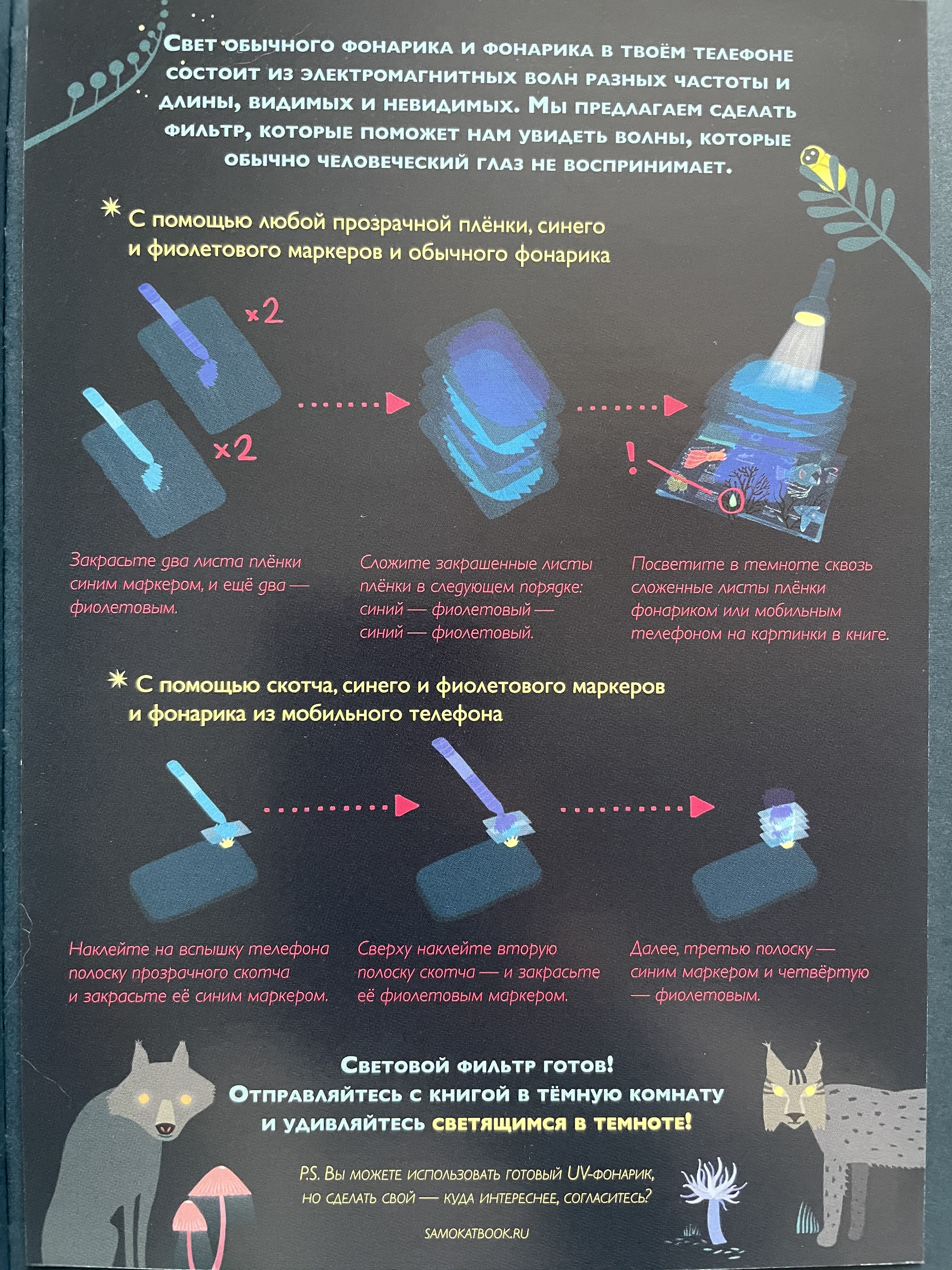 Секретный секрет этой книги в том, что она и в самом деле светится САМА, достаточно включить UV-фонарик, который можно купить, а можно сделать самостоятельно. У кошки светятся глаза, светятся буквы, деревья, точечки. Попробуйте отобрать такую книгу у ребёнка и уложить его спать пораньше! Ничего не выйдет. Поэтому, советую укладываться с ней как минимум за час до обычного времени отбоя — так вы и почитать успеете и насладиться светящимися иллюстрациями и узнать много нового.